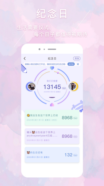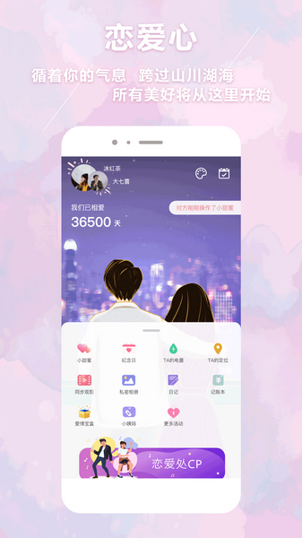 恋爱心APP是一款专为情侣CP所开发的应有,致力与让情侣CP们的恋爱历程变得更加甜蜜,在哪都能有对方的陪伴。情侣使用恋爱心,会为情侣们记录恋爱天数,更有许多功能服务专为情侣量身定制,情侣们可以在恋爱心看到另一半的定位,随时掌握TA的位置,即使不在对方身边也能为对方的安全保驾护航,给了情侣双方感情上极大的安全感。应用更会为情侣们记录每一个大小纪念日,生活需要仪式感,在一起的每一天都弥足珍贵,每个日子都值得被期待,让你们的每一天都是纪念日。用户还可以在应用内记录恋爱中的所有甜蜜瞬间,第一次约会,第一次牵手,第一次接吻众众都弥足珍贵,再以后回过头来看看这些美好瞬间,历历在目,再重新体验一次当时的怦然心动。恋爱心更为情侣们准备了在线互动功能,情侣们可以在应用内隔空接唱,热门歌曲随心接唱,及时不在对方身边也能享受属于两个人的甜蜜时光。快来和你的TA一起下载恋爱心吧!软件功能