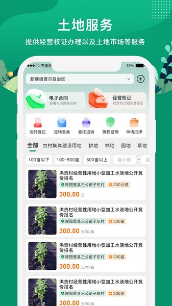 e聚农宝是一款专为新疆地区农民提供服务的种植和土地管理工具。在这款软件中用户可以将自己手中农田的实时信息同步到软件上,包括种植了什么类的作物、长势如何等,方便农民安排农活时间。同时,用户在软件上完成实名认证之后可以申请土地的租赁、转让等,将手中的土地通过渠道流转,也可以申请使用农用机械等。