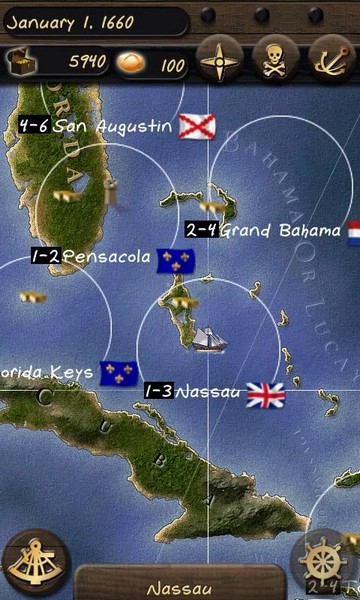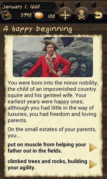 天赋:一进去游戏会有天赋的分配,这会决定你是走单体强大(在决斗中胜率会很大),还是航海的方向(在航海中遇到突发事件的处理能力和贸易走私时的应对力)。