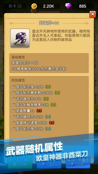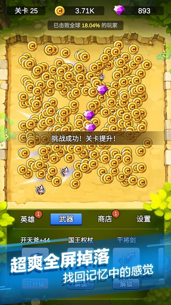 4、金币的获取比较简单,打怪即可,强化武器不但可以增加英雄的攻击力,还可以增加属性。每过五十关都可以解锁一个新的武器,每把武器还有自己的特殊技能,有触发旋风斩的,有触发横向激光,还有触发竖向激光的