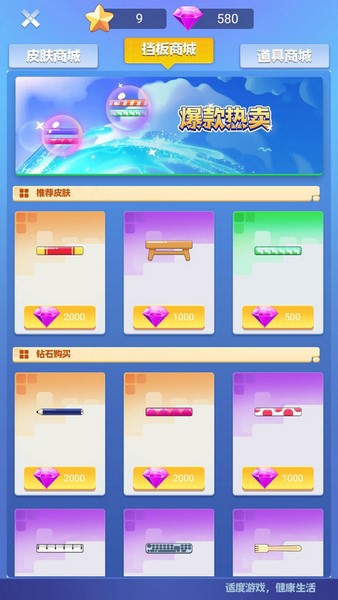 商城分为皮肤商城、挡板商城和道具商城,满足游戏中一切购物需求!