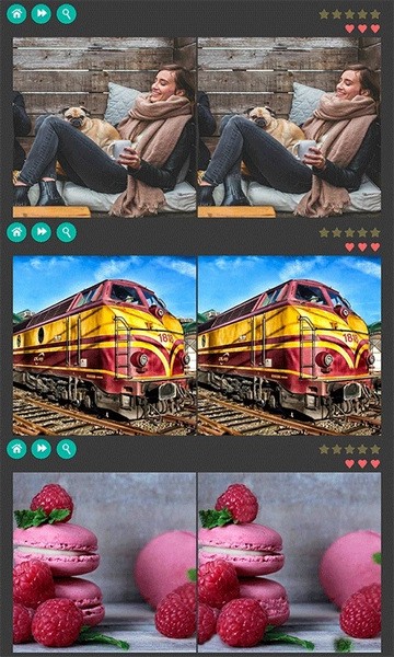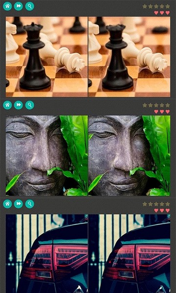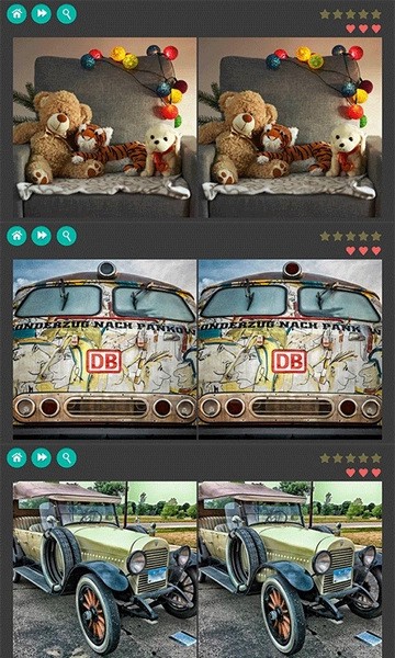 简单的游戏规则——找到两张相似图片中的5个差异,并点击标记其不同之处。你可以使用提示查看图片不同的区域。