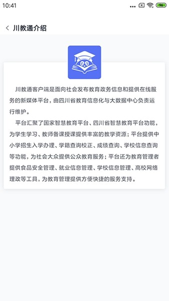 川教通app是一款面向中小学生、家长和老师的综合性教育平台,为师生教育教学和管理工作提供了非常全面的管理。用户可以通过川教通实现中小学入学报名、中小学学籍查询、高考成绩查询、普通话报名考试、全国高校标识码查询等,此外,川教通覆盖了四川全省学校,用户可以通过该平台轻松查到各类教材、试题库、课程资源等,作为一款非常好用的多方位教育软件,川教通汇聚了国家智慧教育平台、四川省智慧教育平台的功能,为师生教育提供了丰富的教学资源。