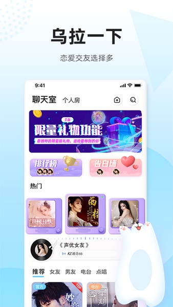 乌拉APP是一款主打在线交友聊天的软件,若是想要拓展自己的朋友圈,那么这款软件绝对是个不错的选择,其界面清爽简约,功能相当强大,汇集了来自全国各地的小伙伴在线畅聊,且每一位均经过严格的审核,让你交友更安心!且软件还可支持根据用户的需求来推荐属性最贴合的TA,在这里和你聊得来的人一些互相陪伴,无论是聊天,一同听歌,还是开黑等,都随你喜欢!