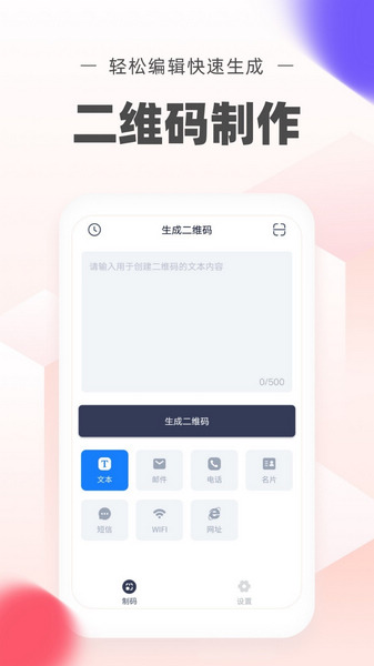 【强大的生成功能】支持10种生成格式1)网址2)名片/通讯录3)文本4)短信5)电话6)电子邮件7)地图坐标8)wifi设置9)微博10)剪帖板内容;