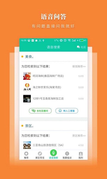 在“语音搜索”功能中通过语音输入,可以快速查找旅游资源信息、咨询常见的旅游问题。复杂问题还可以转人工坐席寻求帮助。