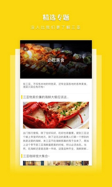 为游客提供在三亚旅游的旅游攻略,包括必玩景点、必吃美食、经典旅游线路等,方便游客更加了解三亚的优质旅游资源,引导游客深度感受三亚旅游的魅力。