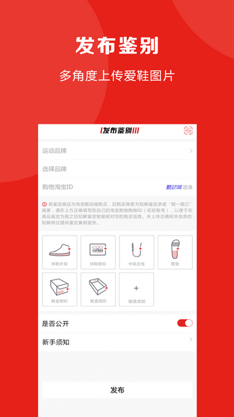 发布需要进行鉴别的运动品牌商品图片信息;
