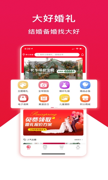 大好婚礼是为结婚消费者提供一站式服务购物的在线消费商城,涵盖:婚纱照旅拍、婚礼策划、结婚筹备指南工具、婚礼用品一站式采购,婚后孕妇照、宝宝照等服务让新人更便捷高效享受系列服务。
