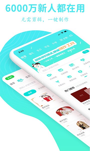 上千个视频模板,包含婚礼开场暖场视频相册、宝宝相册、儿童生日相册、寿宴视频相册、毕业视频相册、节日祝福视频等,省去设计环节,一键成片!助小白快速实现创意作品!