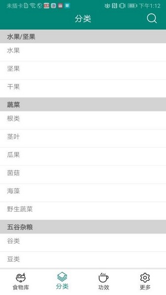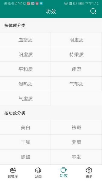 5、在功效页面,按照不同的功效分类,可以快速了解不同食物的功效