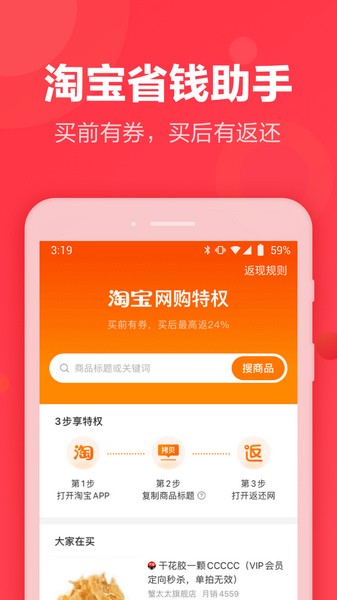 1、返还——淘宝天猫京东唯品会美团等+800家知名商城合作,购物返利随时随地,返利最高50%