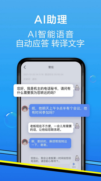【情景接听模式】临时不便接听场景,对来电分级管理,有的正常接听,有的自动拦截并提醒对方原因,通话记录完整呈现。