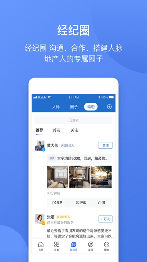 经纪圈,经纪人专属的职业社交圈,让经纪人轻松、精准拓展行业人脉,打造经纪人同业协作圈,提高经纪人变现能力。