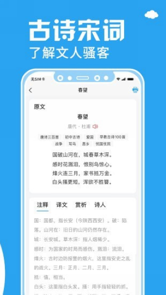 【古诗词】收录所有唐诗宋词文言文,支持搜索,让学习更轻松;