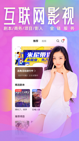 米尼梦工厂app是一款主打影视行业服务的软件,在这里汇集了众多影视艺人、编剧、导演等行业相关人士,你可以轻松快速挖掘各路有潜力的新艺人,也能看到最新娱乐圈的八卦动态,且软件还整合了大量演艺资源,为你解决项目资金、宣发困难等问题,助力影视行业的追梦人,能顺利到达自己想要的目的地!