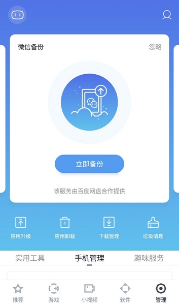 1.在手机上运行百度手机助手后,点击“管理”。