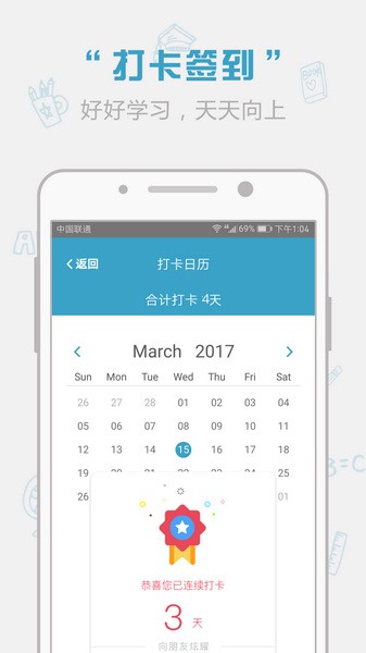 每日签到,记录学习情况,通过考勤,督促用户坚持学习。