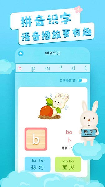 声母、韵母、整体音节,全套拼音内容人声指导让宝宝轻松识拼音读拼音。