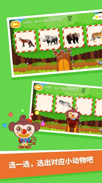 5、选择第三个教学方式“选一选”,这时候需要从上方的文字提示,找到指定的小动物,然后继续找下一个。