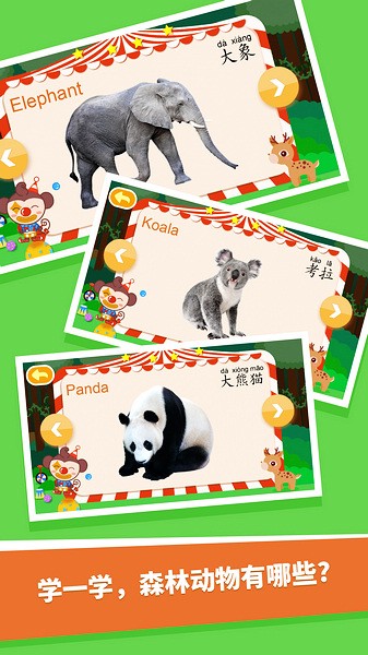 2、里面是各种动物的图片,上面带上中英文字,采用双语的形式让孩子学习两门语言的同时提供孩子对动物的认知。