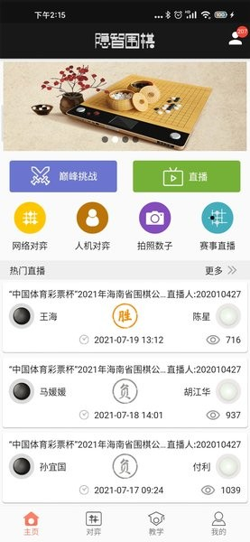 2. 实时赛事直播:可查看隐智智能棋盘正在进行的线下赛事对局,棋盘用户的公开对局。