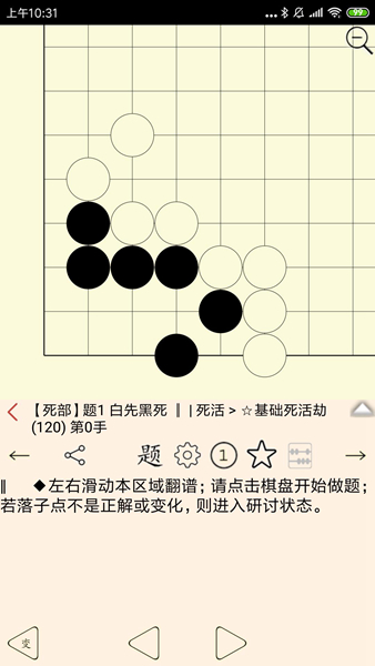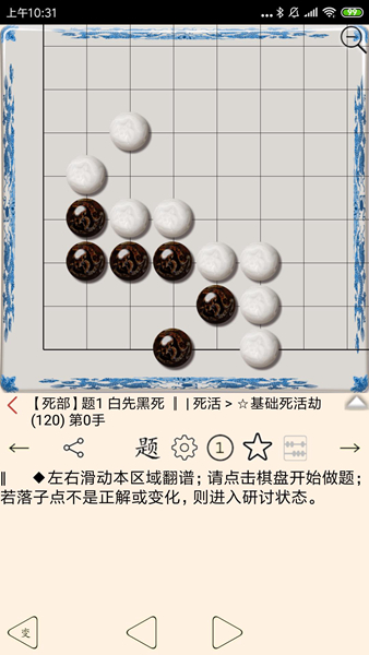 1、支持后手题,即电脑先进攻,人类来防守(仅限棋谱录入范围),以便进行防守练习;设置方法:在习题状态下长按棋盘下的“题”字按钮切换;