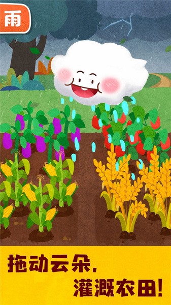 见识到雨天的“威力”,宝宝们是不是对雨,有了深刻的印象呢?再来看看雨的正向作用吧。西红柿、玉米、水稻、葡萄藤……农田和果园里的蔬果们离不开雨水的灌溉。拖动降雨的小云朵,让蔬果的小苗们吸饱水分!瞧,果蔬们长得更好啦。