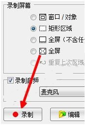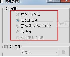 2、在“屏幕录制机”的主界面选择录制的区域:窗口、矩形区域、全屏、全屏(不包含任务栏)
