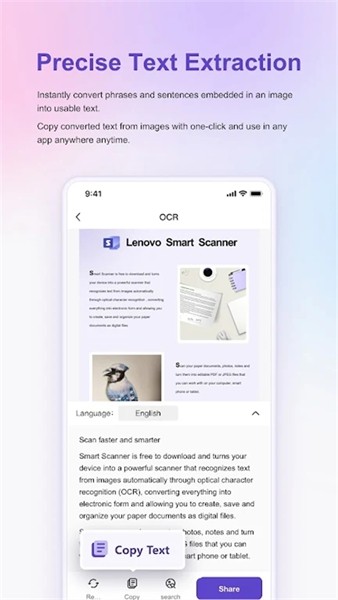 该应用不仅提供了高效的扫描引擎和智能识别功能,而且自动识别边界并裁剪图像,确保高质量的扫描结果。用户可以对扫描的文档进行命名,处理歪斜等问题,并享有多种导出选项和共享方式。联想扫描王支持多语言识别,可以通过邮件等方式轻松分享扫描文件。