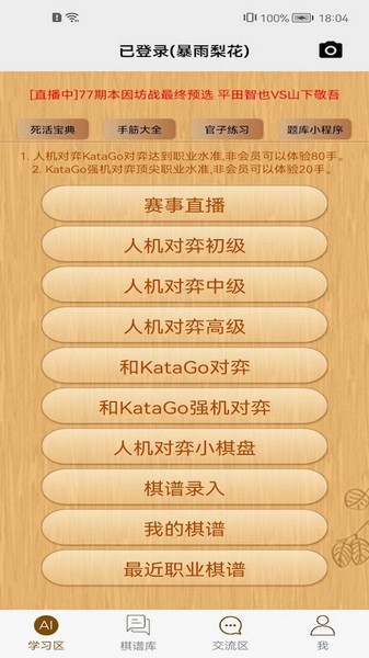 软件还内置了10万局古今棋谱,用户可以自由学习和提高。交流区的设计也很棒,大家可以分享心得和疑问,增加了互动性。每次打开这个应用,我都会觉得它是一个非常强大的围棋学习工具,尤其是对新手来说,提供了很多免费资源,真的挺实用的。