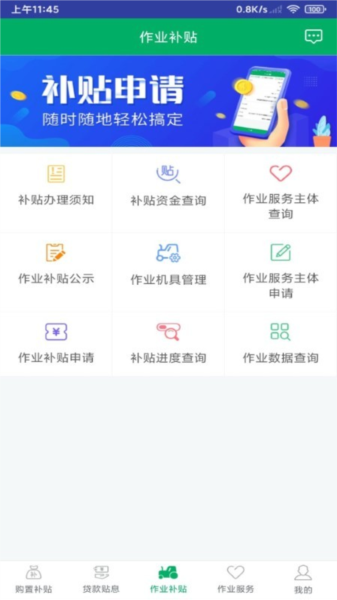 2、作业补贴,各种农机作业补贴申请可以随时在线编辑提交;