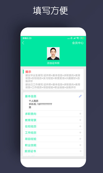 3、智能填写:通过软件可为你推荐智能化的填写方式,让你的简历制作更加方便。