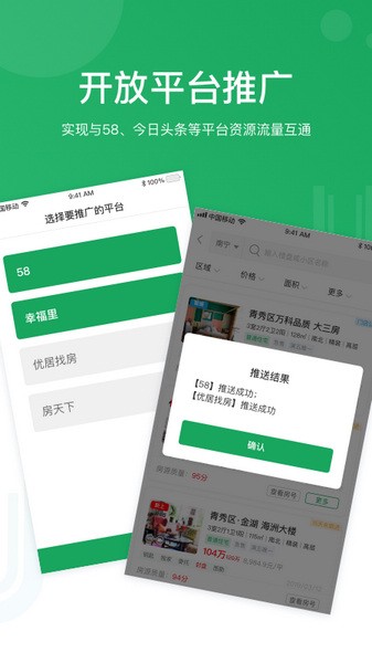 【外部赋能】一键同步58、幸福里、房天下等流量平台;超完善的分享工具;实时结算系统佣金;完善的权证售后体系等。