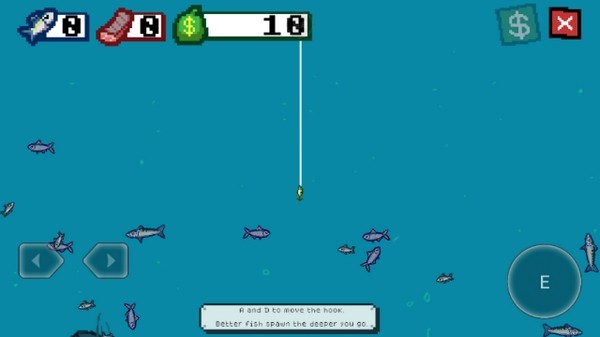 2、使用右下角的按键来控制鱼钩的方向。用鱼钩撞击一条鱼,对它造成伤害,伤害足够后将它钓上来。