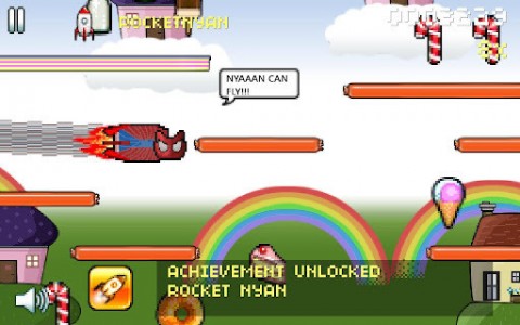 而游戏里出现的道具也是多种多样(其实就是网页版Flash游戏里有的道具),可以吸引蛋糕点心的磁铁、可以让彩虹喵飞行的火箭超人标志、可以让彩虹喵跳得更高的气泡以及可以让彩虹喵变得疯狂或者痴迷的小药丸和小烟卷等等。