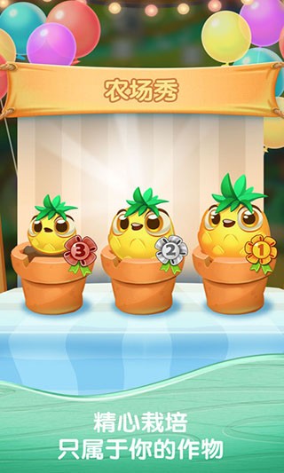 1、游戏呈现出精美的画面效果,采用了卡通Q萌的画风,所有的瓜果蔬菜和动物都被拟人化设计;