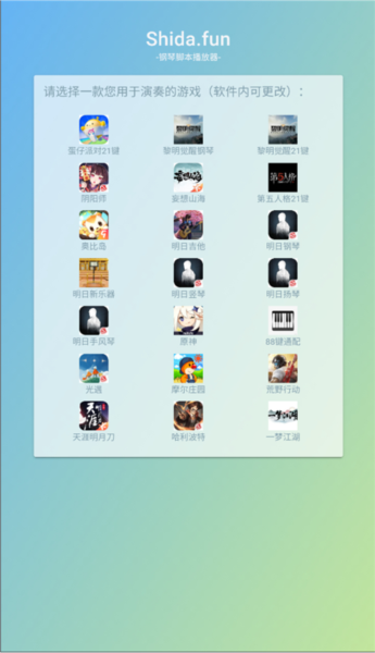 Shida钢琴助手App是一款功能强大的自动钢琴演奏软件,适用于多款主流游戏。它不仅支持丰富的在线曲库,还提供了多种实用功能,帮助玩家在游戏中轻松演奏喜爱的乐曲。用户可以通过简单的操作启动播放器,享受流畅的演奏体验。软件界面设计简洁直观,无需复杂的注册步骤,适合所有水平的玩家使用。Shida钢琴助手不仅支持现有的热门游戏,还不断更新和优化,以满足用户的多样化需求。