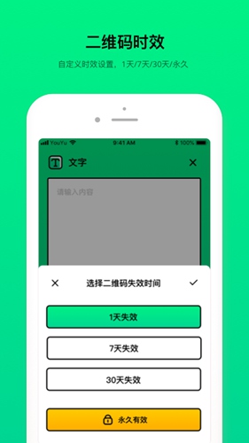 二维码失效时间可自主选择1天、7天、30天,也可生成长久有效二维码,不用担心二维码过多传播;