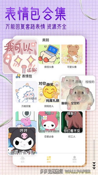 除了壁纸,软件里还有丰富的头像和表情包资源,完全免费使用,非常贴心。搜索功能也很强大,支持关键词搜索和分类检索,找起来特别省事。而且图片加载速度快,高清大图随便用,效果超棒。