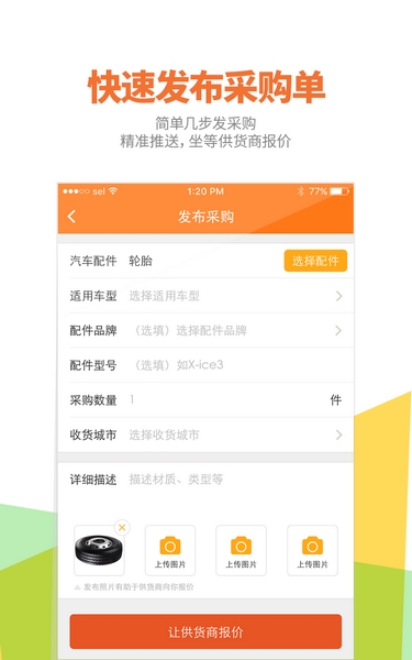 快速发布采购单,通过简单几步即可发布配件采购单,精准推送买家卖家,轻松等待卖家报价;