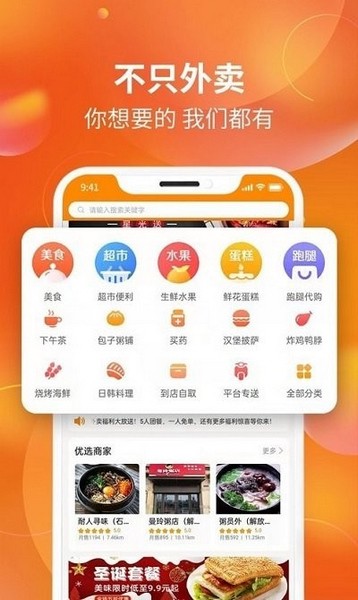 最近更新的内容也很给力,增加了天天领红包、趣味点餐、拼餐团购等福利,功能更全更便宜。现在不仅仅只能点外卖了,还可以在超市、百货、跑腿等功能里下单,满足更多的生活需求。