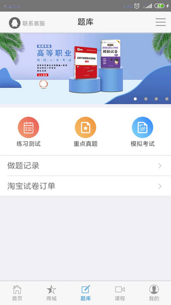 4.题库中包括学科选择、题目活动banner图、练习测试、重点真题、模拟考试、做题记录等功能;