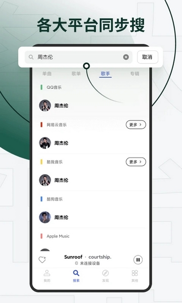 支持网易云、QQ、酷狗、酷我、虾米五大音源搜索,告别下架困扰,找歌方便高效