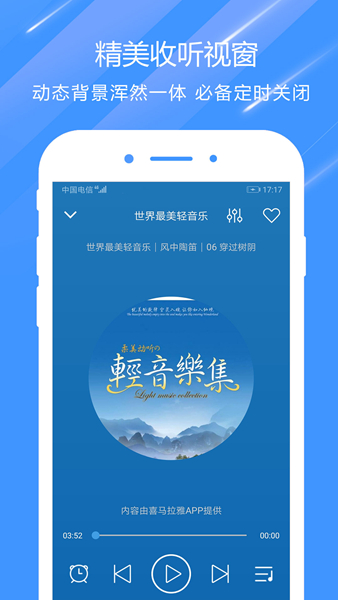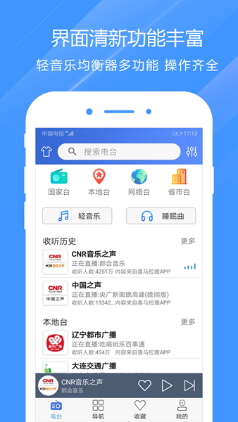 导航分类齐全,涵盖全国各省市1000+电台,还有海量轻音乐等资源,不受地域限制24小时不间断直播电台。
