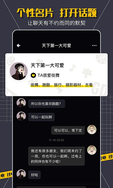 3、根据大家的爱好进行智能匹配,一秒就能找到志趣相投的陌生人,在这里社交互动;
