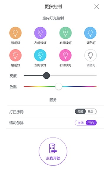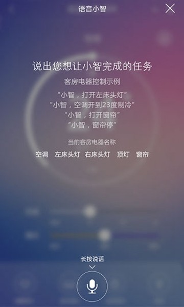 下载智尚酒店APP,并成功入住后,可使用APP实现开门、控制室内空调、电视、窗帘、灯光等