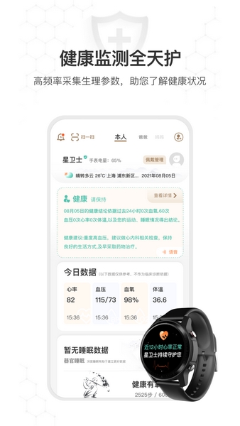 星卫士是一款主打身体健康监测的软件,若是想要确保自己的身体健康,并及时发现自身问题的话,那么便可以使用这款软件进行检测,其通过专用健康管理手表为介质,通过AI大数据建模实时监测用户的身体数据,例如心率、血压、血氧、体温等,本会根据状态实时提醒预警,确保用户提前了解自身健康风险,更有SOS一键救助系统,帮助用户了解自身状态!