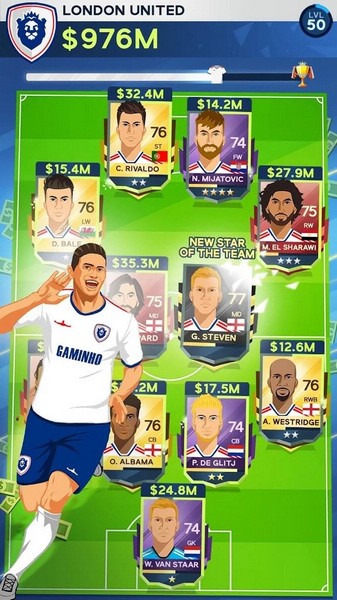 足球巨星交易,利用复杂的转会市场决定买卖谁,寻找足球联盟中的人才或公认的明星,指导和控制球队的训练,从球员身上获得最大利益,并为每场比赛创建自己的梦想联盟、队形和阵容。