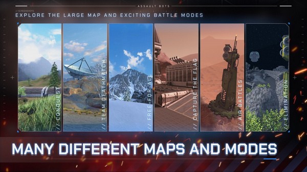 本游戏拥有多种游戏模式,例如团队战、自由混战、占领目标点和对抗电脑。驾驶机器人将所有模式都玩个遍吧!